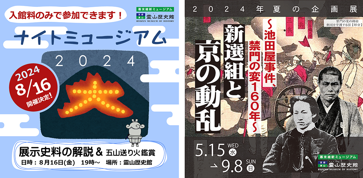 霊山歴史館では、「ナイトミュージアム」を8月16日に開催します。学芸員による開催中の企画展「新選組と京の動乱 ~池田屋事件、禁門の変160年~」や常設展示の解説の後、2階の窓ごしに送り火を鑑賞いただきます。当館からは「船形」、「左大文字」と「鳥居形」を見ることができます。